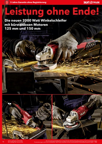 16 Die Ausstattung der Maschinen entspricht der %u00fcblichen Grundausstattung. Technische %u00c4nderungen, Preis%u00e4nderungen und Irrtum vorbehalten. Alle Preise verstehen sich als unverbindliche Preisempfehlung exkl. MwSt. + vRB.Aktion g%u00fcltig bis 31.03.2026Nur solange der Vorrat reicht3 Jahre Garantie ohne RegistrierungLeistung ohne Ende!Die neuen 2000 Watt Winkelschleifer mit b%u00fcrstenlosen Motoren 125 mm und 150 mm