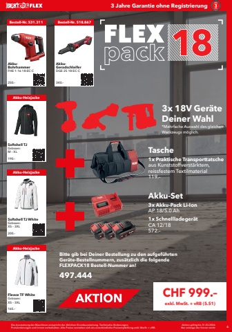 Die Ausstattung der Maschinen entspricht der %u00fcblichen Grundausstattung. Technische %u00c4nderungen, Preis%u00e4nderungen und Irrtum vorbehalten. Alle Preise verstehen sich als unverbindliche Preisempfehlung exkl. MwSt. + vRB. 6 Aktion g%u00fcltig bis 31.03.2026Nur solange der Vorrat reicht3 Jahre Garantie ohne RegistrierungBestell-Nr. 531.311AkkuBohrhammerFHE 1-16 18-EC C250.%u20133x 18V Ger%u00e4te Deiner Wahl*Mehrfache Auswahl des gleichen Werkzeugs m%u00f6glich.Tasche1x Praktische Transporttatscheaus Kunststoffverst%u00e4rktem, reissfestem Textilmaterial 119.%u2013Akku-Set3x Akku-Pack Li-IonAP 18/5.0 Ah1x Schnellladeger%u00e4tCA 12/18572.%u2013Bitte gib bei Deiner Bestellung zu den aufgef%u00fchrten Ger%u00e4te-Bestellnummern, zus%u00e4tzlich die folgende FLEXPACK18 Bestell-Nummer an!497.444CHF 999.%u2013exkl. MwSt. + vRB (5.51)Bestell-Nr. 518.867Akku-HeizjackeSoftshell TJ WhiteGr%u00f6ssen:XS %u2013 3XL200.%u2013Akku-HeizjackeFleece TF WhiteGr%u00f6ssen:XS %u2013 3XL165.%u2013Akku-HeizjackeSoftshell TJGr%u00f6ssen:M %u2013 XL190.%u2013AkkuGeradschleiferDGE 25 18-EC C340.%u2013