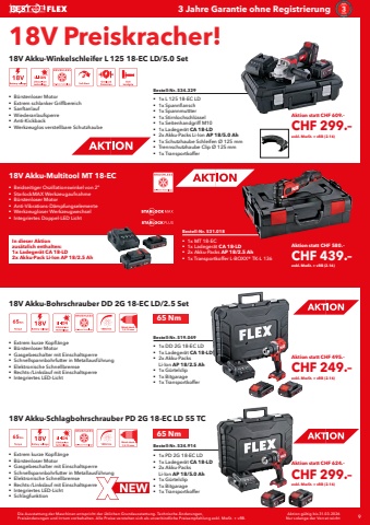 Die Ausstattung der Maschinen entspricht der %u00fcblichen Grundausstattung. Technische %u00c4nderungen, Preis%u00e4nderungen und Irrtum vorbehalten. Alle Preise verstehen sich als unverbindliche Preisempfehlung exkl. MwSt. + vRB. 9 Aktion g%u00fcltig bis 31.03.2026Nur solange der Vorrat reicht3 Jahre Garantie ohne Registrierung18V Preiskracher!18V Akku-Bohrschrauber DD 2G 18-EC LD/2.5 Set%u0083 Extrem kurze Kopfl%u00e4nge%u0083 B%u00fcrstenloser Motor%u0083 Gasgebeschalter mit Einschaltsperre%u0083 Schnellspannbohrfutter in Metallausf%u00fchrung%u0083 Elektronische Schnellbremse%u0083 Rechts-/Linkslauf mit Einschaltsperre%u0083 Integriertes LED-LichtBestell-Nr. 519.049%u0083 1x DD 2G 18-EC LD%u0083 1x Ladeger%u00e4t CA 18-LD%u0083 2x Akku-Packs Li-Ion AP 18/2.5 Ah%u0083 1x G%u00fcrtelclip%u0083 1x Bitgarage%u0083 1x Transportkoffer18V Akku-Winkelschleifer L 125 18-EC LD/5.0 Set%u0083 B%u00fcrstenloser Motor%u0083 Extrem schlanker Griffbereich%u0083 Sanftanlauf%u0083 Wiederanlaufsperre %u0083 Anti-Kickback%u0083 Werkzeuglos verstellbare SchutzhaubeBestell-Nr. 534.329%u0083 1x L 125 18-EC LD%u0083 1x Spannflansch%u0083 1x Spannmuttter%u0083 1x Stirnlochschl%u00fcssel%u0083 1x Seitenhandgriff M10%u0083 1x Ladeger%u00e4t CA 18-LD%u0083 2x Akku-Packs Li-Ion AP 18/5.0 Ah%u0083 1x Schutzhaube Schleifen %u00d8 125 mm%u0083 Trennschutzhaube Clip %u00d8 125 mm%u0083 1x Transportkoffer18V Akku-Schlagbohrschrauber PD 2G 18-EC LD 55 TCBestell-Nr. 534.914%u0083 1x PD 2G 18-EC LD%u0083 1x Ladeger%u00e4t CA 18-LD%u0083 2x Akku-Packs Li-Ion AP 18/5.0 Ah%u0083 1x G%u00fcrtelclip%u0083 1x Bitgarage%u0083 1x Transportkoffer%u0083 Extrem kurze Kopfl%u00e4nge%u0083 B%u00fcrstenloser Motor%u0083 Gasgebeschalter mit Einschaltsperre%u0083 Schnellspannbohrfutter in Metallausf%u00fchrung%u0083 Elektronische Schnellbremse%u0083 Rechts-/Linkslauf mit Einschaltsperre%u0083 Integriertes LED-Licht%u0083 Schlagfunktion65 Nm65 NmMetal chuck1,5-13 mmMetal chuck1,5-13 mmBestell-Nr. 531.018%u0083 1x MT 18-EC%u0083 1x Ladeger%u00e4t CA 18-LD%u0083 2x Akku-Packs AP 18/2.5 Ah%u0083 1x Transportkoffer L-BOXX%u00ae TK-L 13618V Akku-Multitool MT 18-EC%u0083 Beidseitiger Oszillationswinkel von 2%u00b0%u0083 StarlockMAX Werkzeugaufnahme%u0083 B%u00fcrstenloser Motor%u0083 Anti-Vibrations-D%u00e4mpfungselemente%u0083 Werkzeugloser Werkzeugwechsel%u0083 Integriertes Doppel-LED LichtIn dieser Aktion zus%u00e4tzlich enthalten:1x Ladeger%u00e4t CA 18-LD2x Akku-Pack Li-Ion AP 18/2.5 AhAktion statt CHF 609.%u2013CHF 299.%u2013exkl. MwSt. + vRB (2.16)Aktion statt CHF 495.%u2013CHF 249.%u2013exkl. MwSt. + vRB (2.16)Aktion statt CHF 624.%u2013CHF 299.%u2013exkl. MwSt. + vRB (2.16)Aktion statt CHF 580.%u2013CHF 439.%u2013exkl. MwSt. + vRB (2.16)