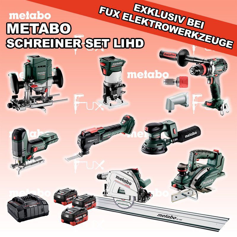 Heute auf dieses Produkt 40% Rabatt! Zu "Schreiner Set" von Metabo FULL Service: 36 Monate zum Nulltarif für Sie! Weitere Infos zum FULL Service Dieses Produkt ist CAS kompatibel! Weitere Infos zu CAS Black Fuxday Aktionen FUX SPECIAL EXKLUSIV BEI FUX Metabo Schreiner Set XXL 3 LiHD Bestell- und Artikelnummer: Schreiner Set XXL 3 LiHD ST 18 LT 130 BL Akku-StichsägeAkkuspannung 18 V Hubzahl 1000-3.500 /min Gewicht ohne Akkupack 1.5 kgInfos BS 18 LTX BL Q I Akku-BohrschrauberAkkuspannung 18 V Drehzahl 0-550 / 0-2000 U/min Drehmoment hart / weich 130 / 65 Nm Gewicht (mit Akkupack) 2.3 kgInfos FMV 18 LTX BL 8 Akku Kantenfräse Akkuspannung 18 V Leerlaufdrehzahl 4.800 - 29.000 /min Spannbohrung der Spannzange 6 / 8 mmInfos OFV 18 LTX BL 12 Akku-OberfräseAkkuspannung 18 V Leerlaufdrehzahl 11.000 - 25.000 / min Spannbohrung der Spannzange 6 / 8 / 12 mm Gewicht ohne Akkupack 2.900 gInfos KT 18 LTX 66 BL Akku TauchkreissägeAkkuspannung 18 V Schnitt-Tiefe bei 90° 0-66 mm Sägeblatt 165 mm Gewicht 5.3 kgInfos HO 18 LTX 20-82 Akku-Einhand-HobelAkkuspannung 18 V Hobelbreite 82 mm Spanabnahme einstellbar 0-2 mm Gewicht 3.5 KgInfos MT 18 LTX BL QSL Akku-Multitool Akkuspannung 18 V Schwingzahl bei Leerlauf 8.000 - 20.000 /min Schleifplatte, Maß Eck zu Eck 93 mm Gewicht 1.7 kgInfos SXA 18 LTX 125 BL Exzenterschleifer Akkuspannung 18 V Durchmesser des Stütztellers 125 mm Leerlaufdrehzahl 4000 - 10000 /min Gewicht (mit Akkupack) 1.7 kg Infos FS 160 FührungsschieneGesamtlänge 1600 mmInfos 3 x 18 V, 5.5 Ah, LiHD Akkupack18 V 5.5 Ah ( LiHD Akkus ) Infos ASC 145, 12 - 36 V "Air Cooled" LadegerätZum Aufladen aller Li-Power Schiebesitz-Akkupacks (12 V - 36 V). Ladestrom 8.0 AInfos Schnellwechselbithalter »Quick«Schnellwechselbithalter »Quick« Geeignet für alle Metabo "Quick" Maschinen Bits mit 1/4 "Außensechskantantrieb Infos Schnellwechselwinkeladapter »Quick«Metabo "Quick" Maschinen mit Spannzange Ø 43 mm Magnetischer Bithalter mit 1/4 "(6,35 mm) SechskantschaftInfos Registriere die in diesem Set vorhandenen Metabo Maschinen auf metabo.ch, und ergattere dir bis zu 5 Gratis Akkus!Zusätzlich offerieren wir zu diesem Set einen Gratis Akku! Standard-Ausrüstung In diesem Set enthalten: ST 18 LT 130 BL Akku-Stichsäge BS 18 LTX BL Q I Akku-Bohrschrauber FMV 18 LTX BL 8 Akku Kantenfräse OFV 18 LTX BL 12 Akku-Oberfräse KT 18 LTX 66 BL Akku Tauchkreissäge HO 18 LTX 20-82 Akku-Einhand-Hobel MT 18 LTX BL QSL Akku-Multitool SXA 18 LTX 125 BL Exzenterschleifer FS 160 Führungsschiene 3 x 18 V, 5.5 Ah, LiHD Akkupack ASC 145, 12 - 36 V "Air Cooled" Ladegerät Schnellwechselbithalter »Quick« Schnellwechselwinkeladapter »Quick« Zubehör Verbrauchsmaterial Listenpreis CHF 3'598.50 Fuxpreis CHF 2'159.00 inkl. 8.1% MwSt, inkl vRG Versand CHF 40.00 Kein Grauimport! Produkt bestellen 1 Stück 2 Stück 3 Stück 4 Stück 5 Stück 6 Stück 7 Stück 8 Stück 9 Stück 10 Stück Alle Angaben ohne Gewähr und solange Vorrat reicht!Wiederverkäufer werden? Produkt als PDFVideo LiHD 1Video LiHD 2 AKTION 40%