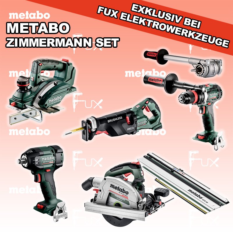 Heute auf dieses Produkt 27% Rabatt! Zu "Zimmermann Set" von Metabo FULL Service: 36 Monate zum Nulltarif für Sie! Weitere Infos zum FULL Service Dieses Produkt ist CAS kompatibel! Weitere Infos zu CAS Black Fuxday Aktionen FUX SPECIAL EXKLUSIV BEI FUX Metabo Zimmermann SET 2 SOLO Bestell- und Artikelnummer: Zimmermann SET 2 SOLO BS 18 LTX BL Q I Akku-BohrschrauberAkkuspannung 18 V Drehzahl 0-550 / 0-2000 U/min Drehmoment hart / weich 130 / 65 Nm Gewicht (mit Akkupack) 2.3 kgInfos SSW 18 LTX 550 BL Akku-SchlagschrauberAkkuspannung 18 V Anziehdrehmoment 550 Nm Werkzeugaufnahme 1/2" Gewicht ohne Akkupack 1,4 kgInfos SSEP 18 LTX BL MVT Akku-SäbelsägeAkkuspannung 18 V Hubzahl bei Leerlauf 0 - 3.000 /min Gewicht (mit Akkupack) 4.6 kgInfos HO 18 LTX 20-82 Akku-Einhand-HobelAkkuspannung 18 V Hobelbreite 82 mm Spanabnahme einstellbar 0-2 mm Gewicht 3.5 KgInfos KS 18 LTX 66 BL Akku HandkreissägeAkkuspannung 18 V Schnitt-Tiefe bei 90° 0-66 mm Sägeblatt 165 mm Gewicht 4.5 kgInfos Drehmomentvorsatz Power X3Drehmomentvorsatz ermöglicht dreifache Leistungssteigerung der Maschine (Drehmoment) für härteste AnwendungenInfos Kappschiene KFS 44Gesamtlänge 834 mm Schnittlänge 440 mmInfos Registriere die in diesem Set vorhandenen Metabo Maschinen auf metabo.ch, und ergattere dir bis zu 5 Gratis Akkus!Zusätzlich offerieren wir zu diesem Set einen Gratis Akku!OHNE AKKUS UND LADEGERÄT Standard-Ausrüstung In diesem Set enthalten: BS 18 LTX BL Q I Akku-Bohrschrauber SSW 18 LTX 550 BL Akku-Schlagschrauber SSEP 18 LTX BL MVT Akku-Säbelsäge HO 18 LTX 20-82 Akku-Einhand-Hobel KS 18 LTX 66 BL Akku Handkreissäge Drehmomentvorsatz Power X3 Kappschiene KFS 44 Listenpreis CHF 2'148.50 Fuxpreis CHF 1'553.00 inkl. 8.1% MwSt, inkl vRG Versand CHF 25.00 Kein Grauimport! Produkt bestellen 1 Stück 2 Stück 3 Stück 4 Stück 5 Stück 6 Stück 7 Stück 8 Stück 9 Stück 10 Stück Alle Angaben ohne Gewähr und solange Vorrat reicht!Wiederverkäufer werden? Produkt als PDF NEUHEITAKTION 27%