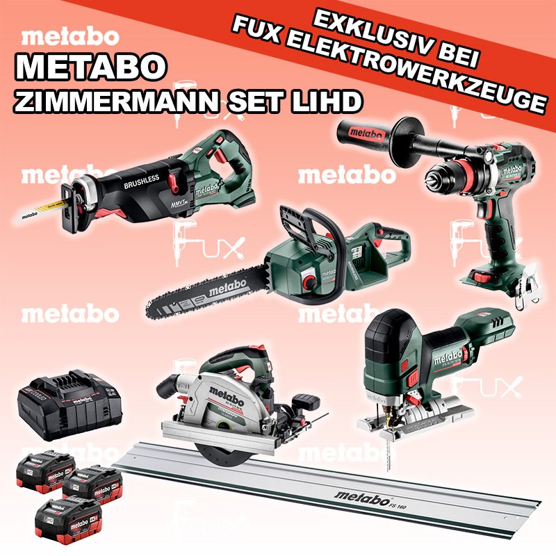 Heute auf dieses Produkt 27% Rabatt! Zu "Zimmermann Set" von Metabo FULL Service: 36 Monate zum Nulltarif für Sie! Weitere Infos zum FULL Service Dieses Produkt ist CAS kompatibel! Weitere Infos zu CAS Black Fuxday Aktionen FUX SPECIAL EXKLUSIV BEI FUX Metabo Zimmermann SET 16 LiHD Bestell- und Artikelnummer: Zimmermann SET 16 LiHD BS 18 LTX BL Q I Akku-BohrschrauberAkkuspannung 18 V Drehzahl 0-550 / 0-2000 U/min Drehmoment hart / weich 130 / 65 Nm Gewicht (mit Akkupack) 2.3 kgInfos MS 36-18 LTX BL 40 Akku KettensägeAkkuspannung 18 V Schnittlänge 36 cm Max. Kettengeschwindigkeit 22 m/s Gewicht mit Akkupack 4,6 kgInfos SSEP 18 LTX BL MVT Akku-SäbelsägeAkkuspannung 18 V Hubzahl bei Leerlauf 0 - 3.000 /min Gewicht (mit Akkupack) 4.6 kgInfos STA 18 LTX 150 BL Akku-StichsägeAkkuspannung 18 V Hubzahl 1.000-3.500 /min Gewicht ohne Akkupack 1.9 kgInfos KS 18 LTX 66 BL Akku HandkreissägeAkkuspannung 18 V Schnitt-Tiefe bei 90° 0-66 mm Sägeblatt 165 mm Gewicht 4.5 kgInfos FS 160 FührungsschieneGesamtlänge 1600 mmInfos 3 x 18 V, 5.5 Ah, LiHD Akkupack18 V 5.5 Ah ( LiHD Akkus ) Infos ASC 145, 12 - 36 V "Air Cooled" LadegerätZum Aufladen aller Li-Power Schiebesitz-Akkupacks (12 V - 36 V). Ladestrom 8.0 AInfos Registriere die in diesem Set vorhandenen Metabo Maschinen auf metabo.ch, und ergattere dir bis zu 5 Gratis Akkus!Zusätzlich offerieren wir zu diesem Set einen Gratis Akku! Standard-Ausrüstung In diesem Set enthalten: BS 18 LTX BL Q I Akku-Bohrschrauber MS 36-18 LTX BL 40 Akku Kettensäge SSEP 18 LTX BL MVT Akku-Säbelsäge STA 18 LTX 150 BL Akku-Stichsäge KS 18 LTX 66 BL Akku Handkreissäge FS 160 Führungsschiene 3 x 18 V, 5.5 Ah, LiHD Akkupack ASC 145, 12 - 36 V "Air Cooled" Ladegerät Listenpreis CHF 2'581.50 Fuxpreis CHF 1'866.00 inkl. 8.1% MwSt, inkl vRG Versand CHF 25.00 Kein Grauimport! Produkt bestellen 1 Stück 2 Stück 3 Stück 4 Stück 5 Stück 6 Stück 7 Stück 8 Stück 9 Stück 10 Stück Alle Angaben ohne Gewähr und solange Vorrat reicht!Wiederverkäufer werden? Produkt als PDF NEUHEITAKTION 27%