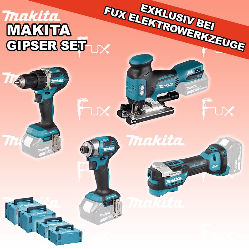 Das Ladenlokal bleibt vom 25. Dezember 2025 bis am 04. Januar 2026 geschlossen. Bestellungen und Lieferungen von Neugeräten werden trotz Ferienabwesenheit in gewohnter Fux-Manier entgegengenommen und ausgeliefert. Zu "Gipser Set" von Makita FUX SPECIAL EXKLUSIV BEI FUX Makita Gipser Set 4 SOLO Bestell- und Artikelnummer: maGipser Set 4 SOLO DDF484ZJ Akku-BohrschrauberAkkuspannung 18 V Drehzahlen 0-500 / 0-2000 U/min Drehmoment hart / weich 54 / 30 Nm Gewicht 1.5 kgInfos DTD173Z Akku-SchlagschrauberAkkuspannung 18 V Anziehdrehmoment 20 / 50 / 170 / 180 Nm Werkzeugaufnahme 1/4" (Innensechskant) Gewicht inkl. Akku 1.2 - 1.5 kgInfos DTM52Z Multifunktions WerkzeugAkkuspannung 18 V Schwingungen 10000 - 20000 min-1 Werkzeugaufnahme Starlock Max System Gewicht inkl. Akku 2.0 kg Infos DJV18ZJ Akku-StichsägeAkkuspannung 18 V Hubzahl 800 - 3500/ min Schnittleistung Holz 135 mm / Stahl 10 mm Gewicht 2.5 kgInfos MAKPAC Gr. 3Produktabmessung (L x B x H) 377 x 277 x 176 mm Infos Einsatz für DTM52 Einsatz für DTM52 Makpac Koffer Typ C (821551-8) Infos MAKPAC Gr. 2Produktabmessung (L x B x H) 395 x 295 x 163 mm Infos Einsatz für diverse Schlagschrauber Einsatz für DDF083, DDF483, DHP483, DTD134, DTD137, DTD146, DTD148, DTD152, DTD153, DTD154, DTD155, DTD170, DTD171, DTP131, DTP141, DTS130, DTS131, DTS141, DTW180, DTW181, DTW250, DTW251, DTW284, DTW285Infos OHNE AKKUS UND LADEGERÄT Standard-Ausrüstung In diesem Set enthalten: DDF484ZJ Akku-Bohrschrauber DTD173Z Akku-Schlagschrauber DTM52Z Multifunktions Werkzeug DJV18ZJ Akku-Stichsäge MAKPAC Gr. 3 Einsatz für DTM52 MAKPAC Gr. 2 Einsatz für diverse Schlagschrauber Geliefert im Koffer Zubehör Listenpreis CHF 1'188.00 Fuxpreis CHF 804.00 inkl. 8.1% MwSt, inkl vRG Versand CHF 20.00 Kein Grauimport! Produkt bestellen 1 Stück 2 Stück 3 Stück 4 Stück 5 Stück 6 Stück 7 Stück 8 Stück 9 Stück 10 Stück Option: Makita BL 1860 B ( Li-lon Akku ) für CHF 95.- statt CHF 124.-Infos Alle Angaben ohne Gewähr und solange Vorrat reicht!Wiederverkäufer werden? Produkt als PDF NEUHEITAKTION 32%