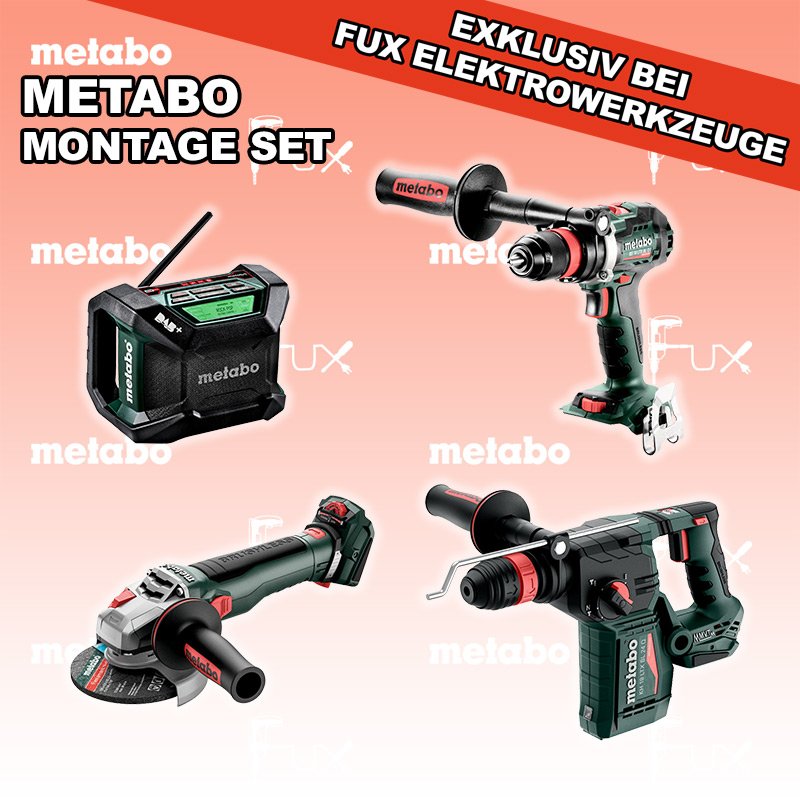 Zu "Montage Set" von Metabo FULL Service: 36 Monate zum Nulltarif für Sie! Weitere Infos zum FULL Service Dieses Produkt ist CAS kompatibel! Weitere Infos zu CAS FUX SPECIAL EXKLUSIV BEI FUX Metabo Montage Set 9 SOLO Bestell- und Artikelnummer: meMontage Set 9 SOLO KH 18 LTX BL 24 Q Akku-KombihammerAkkuspannung 18 V Einzelschlagstärke 2.2 J Bohrleistung in Beton 24 mm Gewicht ohne Akkupack 3 kgInfos WB 18 LTX BL 15-125 Quick Akku-Winkelschleifer Akkuspannung 18 V so stark wie ein 1500 Watt Netzgerät Drehzahl 10000 U / min Ø 125 mm Scheiben Gewicht mit Akkupack 2,7 kgInfos R 12-18 DAB+ BT Akku-BaustellenradioDAB+ Akkuspannung 12 V / 18 V Extreme Akkupacks mit 14,4 und 18 Volt Gewicht 1.85 kgInfos BS 18 LTX BL Q I Akku-BohrschrauberAkkuspannung 18 V Drehzahl 0-550 / 0-2000 U/min Drehmoment hart / weich 130 / 65 Nm Gewicht (mit Akkupack) 2.3 kgInfos Registriere die in diesem Set vorhandenen Metabo Maschinen auf metabo.ch, und ergattere dir bis zu 5 Gratis Akkus!Zusätzlich offerieren wir zu diesem Set einen Gratis Akku!OHNE AKKUS UND LADEGERÄT Standard-Ausrüstung In diesem Set enthalten: KH 18 LTX BL 24 Q Akku-Kombihammer WB 18 LTX BL 15-125 Quick Akku-Winkelschleifer R 12-18 DAB+ BT Akku-Baustellenradio BS 18 LTX BL Q I Akku-Bohrschrauber Zubehör Verbrauchsmaterial Listenpreis CHF 1'276.00 Fuxpreis CHF 766.00 inklusive 8.1% MwSt Versand CHF 40.00 Kein Grauimport! Produkt bestellen 1 Stück 2 Stück 3 Stück 4 Stück 5 Stück 6 Stück 7 Stück 8 Stück 9 Stück 10 Stück Alle Angaben ohne Gewähr und solange Vorrat reicht!Wiederverkäufer werden? Produkt als PDFVideo LiHD 1Video LiHD 2 NEUHEITAKTION 40%