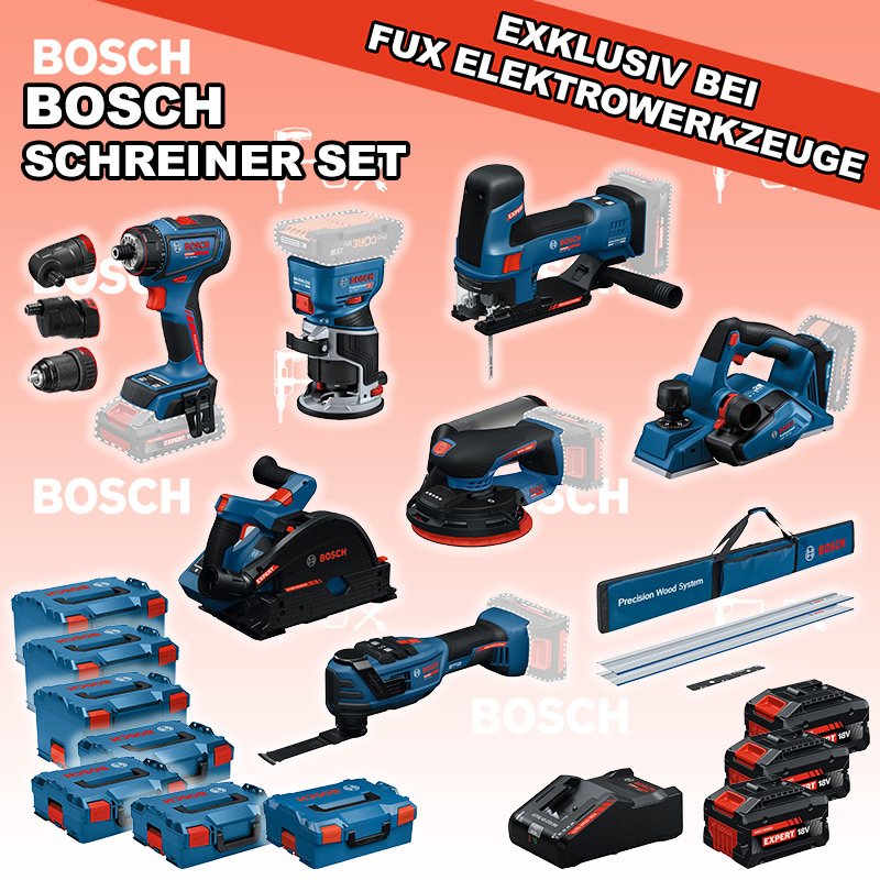 Das Ladenlokal bleibt vom 23. Februar 2026 bis am 28. Februar 2026 geschlossen. Bestellungen und Lieferungen von Neugeräten werden trotz Ferienabwesenheit in gewohnter Fux-Manier entgegengenommen und ausgeliefert. Zu "Schreiner Set" von Bosch Professional FUX SPECIAL EXKLUSIV BEI FUX Bosch Expert EXSchreiner Set 11 Bestell- und Artikelnummer: Bosch Schreiner Set 11 5 Jahre Garantie auf Bosch Expert Maschinen EXST18V-155S Akku-StichsägeAkkuspannung 18 V Hubzahl bei Leerlauf 800 - 3800 min⁻¹ Hubhöhe 26 mm Gewicht exkl. Akku 1.9 kgInfos EXSR18V-90FC Akku-BohrschrauberAkkuspannung 18 V Drehmoment 36 / 65 / - Nm Leerlaufdrehzahl 0 – 630 / 0 – 2100 min⁻¹ Gewicht exkl. Akku 0.92 kgInfos GKF 18V-8 Akku-KantenfräseAkkuspannung 18 V Leerlaufdrehzahl 10000 – 30000 min⁻¹ 6 mm, 8 mm, 1/4'' Gewicht exkl. Akku 1.1 kg Infos EXKT18V-52G Akku-TauchsägeAkkuspannung 18 V Leerlaufdrehzahl 2800 – 5500 min⁻¹ Gewicht exkl. Akku 4.1 kgInfos GHO 18V-26 Akku-EinhandhobelAkkuspannung 18 V Spanabnahme einstellbar 0 - 2.6 mm Infos EXOP18V-40 Akku-Multi-CutterAkkuspannung 18 V Leerlaufschwingzahl 10000 – 20000 min⁻¹ Oszillationswinkel links und rechts 2 ° Gewicht exkl. Akku 1.24 kgInfos EXEX18V-150-5 Akku-ExzenterschleiferAkkuspannung 18 V Schleifteller-Ø 150 mm Leerlaufdrehzahl 5000 – 10000 Umin Schwingzahl 10000 – 20000 min⁻¹ Gewicht exkl. Akku 1.2 kgInfos FSN 1400 Set Führungsschienensysteme Systemzubehör2 x Führungsschiene FSN 1400 Verbindungsstück FSN VEL Tasche FSN BAGInfos 3x EXBA18V-80 + EXAL18V-160 Starter-Set3 x EXBA18V-80 Akkupack EXAL18V-160 LadegerätInfos Standard-Ausrüstung In diesem Set enthalten: EXST18V-155S Akku-Stichsäge EXSR18V-90FC Akku-Bohrschrauber GKF 18V-8 Akku-Kantenfräse EXKT18V-52G Akku-Tauchsäge GHO 18V-26 Akku-Einhandhobel EXOP18V-40 Akku-Multi-Cutter EXEX18V-150-5 Akku-Exzenterschleifer FSN 1400 Set Führungsschienensysteme Systemzubehör 3x EXBA18V-80 + EXAL18V-160 Starter-Set Geliefert im Koffer Zubehör Listenpreis CHF 3'744.80 Fuxpreis CHF 2'889.00 inklusive 8.1% MwSt Kostenloser Versand Kein Grauimport! Produkt bestellen Das Produkt ist momentan nicht lieferbar!Bestätigen sie, dass sie damit einverstanden sind! 1 Stück 2 Stück 3 Stück 4 Stück 5 Stück 6 Stück 7 Stück 8 Stück 9 Stück 10 Stück Alle Angaben ohne Gewähr und solange Vorrat reicht! Produkt als PDF NEUHEITAKTION 22%