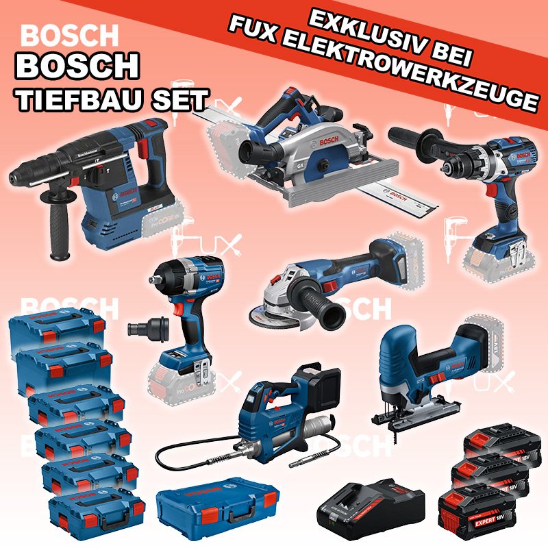 Zu "Bau / Tiefbau Set" von Bosch Professional FUX SPECIAL EXKLUSIV BEI FUX Bosch Professional Tiefbau Set 3 Bestell- und Artikelnummer: BOTiefbau Set 3 GSR 18V-110 C Akku-BohrschrauberAkkuspannung 18 V Drehzahlen 0-480 / 0-2100 U/min Drehmoment weich / hart / max. 47 / 85 / 110 Nm Gewicht 2.2 kgInfos GBH 18V-26 F Akku-BohrhammerAkkuspannung 18 V Einzelschlagstärke 2.6 J Bohrleistung in Beton 4 - 26 mm Gewicht Netto 3.0 kgInfos GST 18V-125 S Akku-StichsägeAkkuspannung 18 V Hubzahl bei Leerlauf 500 - 3500 min⁻¹ Hubhöhe 26 mm Gewicht exkl. Akku 1.9 kgInfos GWS 18V-15 C Akku-Winkelschleifer BiturboAkkuspannung 18 V Leerlaufdrehzahl 11000 U / min 125 mm Scheiben Gewicht inkl. Akku 3.2 kg Infos GDS 18V-750 C Akku-DrehschlagschrauberAkkuspannung 18 V Drehzahlen 0 - 2400 min⁻¹ Drehmoment, max. 750 Nm Gewicht exkl. Akku 1.7 kgInfos GFP 18V-10 Akku-KartuschenpresseAkkuspannung 18 V Druck max. 9’999.9 psi Durchflussmenge bis 320 g/minInfos GKS 18V-57 G Akku-HandkreissägeAkkuspannung 18 V Schnittiefe bei 90° 57 mm Schnittiefe bei 45° 42 mm Sägeblatt / Bohrungs Ø 165 / 20 mm Leerlaufdrehzahl 2500 – 5000 min⁻¹Infos Reduktions Adapter 1/2" auf 1/4" Aufnahme Max. 350 Nm Länge 45 mmInfos FSN 1600 Führungsschienensysteme Systemzubehör1600-mm-Führungsschienentechnologie für exaktes SchneidenInfos 3x EXBA18V-80 + EXAL18V-160 Starter-Set3 x EXBA18V-80 Akkupack EXAL18V-160 LadegerätInfos Standard-Ausrüstung In diesem Set enthalten: GSR 18V-110 C Akku-Bohrschrauber GBH 18V-26 F Akku-Bohrhammer GST 18V-125 S Akku-Stichsäge GWS 18V-15 C Akku-Winkelschleifer Biturbo GDS 18V-750 C Akku-Drehschlagschrauber GFP 18V-10 Akku-Kartuschenpresse GKS 18V-57 G Akku-Handkreissäge Reduktions Adapter FSN 1600 Führungsschienensysteme Systemzubehör 3x EXBA18V-80 + EXAL18V-160 Starter-Set Geliefert im Koffer Zubehör Listenpreis CHF 3'315.30 Fuxpreis CHF 2'493.00 inklusive 8.1% MwSt Frankolieferung Kein Grauimport! Produkt bestellen 1 Stück 2 Stück 3 Stück 4 Stück 5 Stück 6 Stück 7 Stück 8 Stück 9 Stück 10 Stück Alle Angaben ohne Gewähr und solange Vorrat reicht! Produkt als PDF NEUHEITAKTION 24%